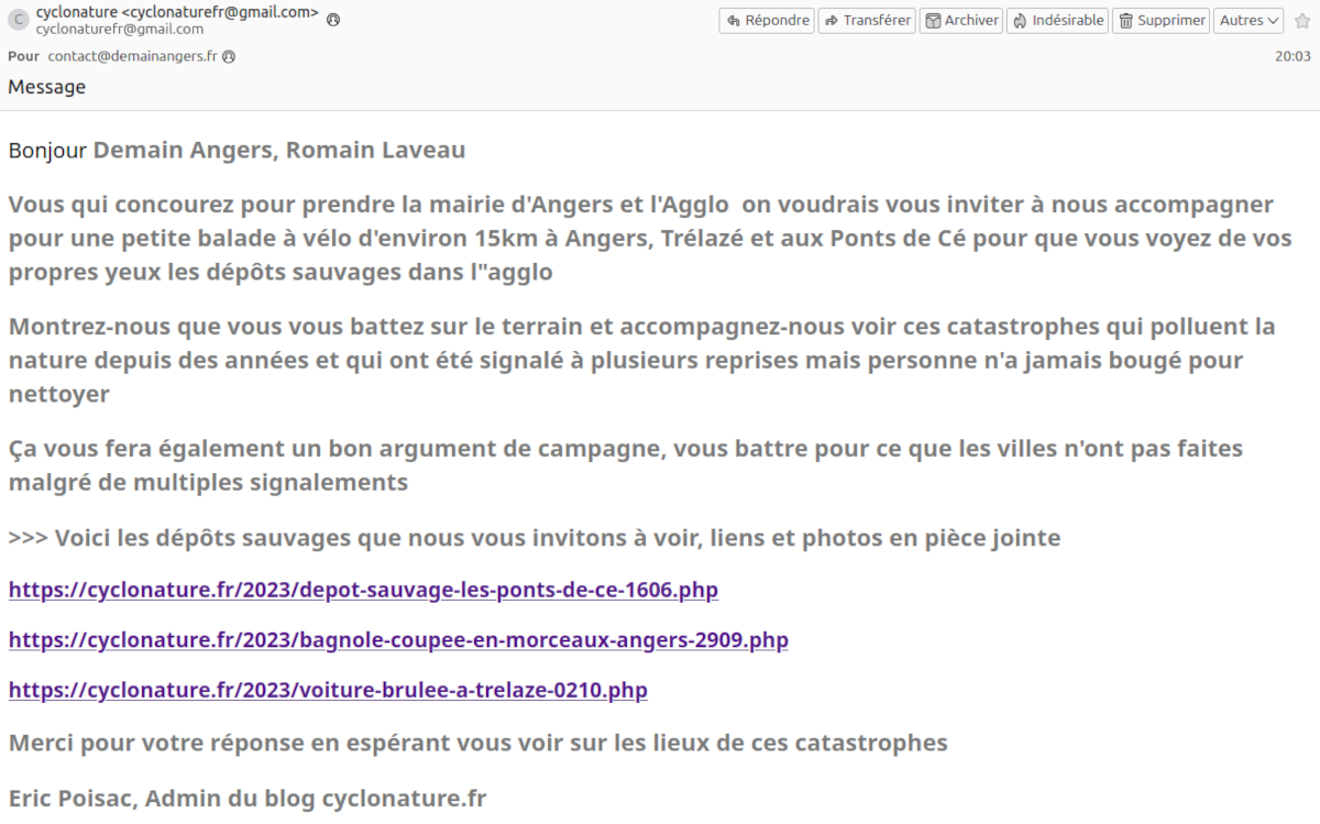 L'invitation à Romain Laveau à prendre connaissance de la catastrophe des dépôts sauvages à Angers et ses environs